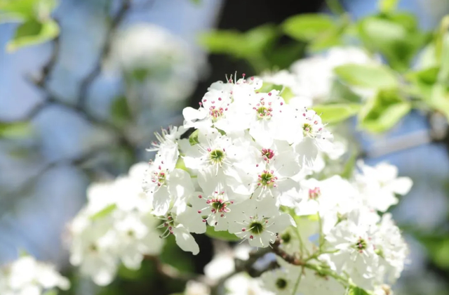 随着时间的推移,那一树树洁白无瑕的梨花,像一群翩翩起舞的女子,随风而舞,旋转闪挪,婀娜多姿,清新自然,沁人心脾,令人心旷神怡,醉在其中不能自拔。梨属植物,北京常见杜梨和豆梨(这个园林常见),远郊有梨树(可以吃的那种梨树),一树梨花压海棠,可见梨花盛开也是很壮观的,梨花如雪,白得很透彻,花叶同放,花药是红色或者紫红色,这个是最主要的特点。