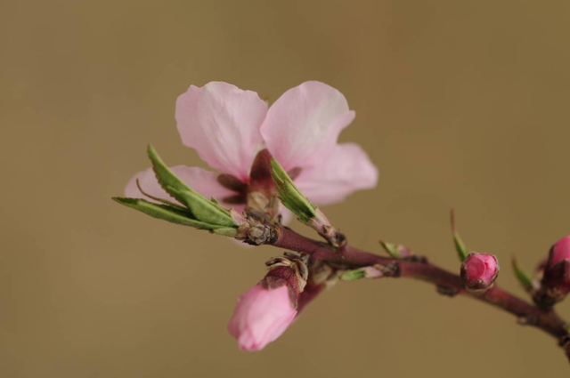 桃的幼叶刚长出时是对折的,另外山桃树干红褐色,有光泽,小枝灰色,也是先花后叶,花粉白色;而碧桃树干灰色,小枝向阳面红色,背阳面绿色,花粉红色,花叶同放。