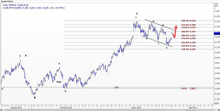 技术面看,棕榈油FCPOc3可能突破每吨4242林吉特的阻力位并进一步上涨,因为自3月15日高点4327林吉特的回调似乎已经完成。
