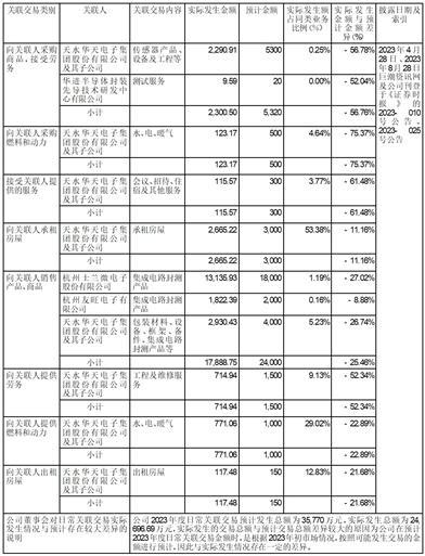 根据公司日常经营需要,预计2024年公司及控股子公司与关联人杭州士兰微电子股份有限公司、杭州友旺电子有限公司、天水华天电子集团股份有限公司及其子公司、华进半导体封装先导技术研发中心有限公司进行采购、销售等各类日常关联交易不超过31,940万元。2023年度公司与关联人实际发生的交易总额为24,696.69万元。