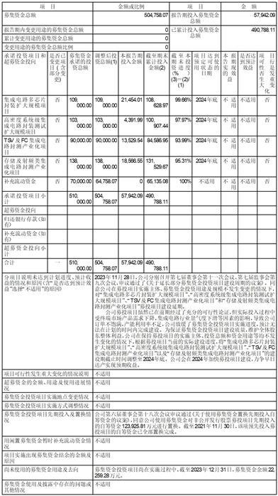 (5)公司根据集成电路市场发展及客户需求情况,实施募集资金投资项目及华天江苏等新生产基地建设。在募集资金投资项目方面,截至报告期末,已使用募集资金49.08亿元,并计划2024年完成募集资金投资项目建设。在新生产基地建设方面,Unisem Gopeng正在进行厂房建设,华天江苏一期及华天上海完成厂房及配套设施建设,并积极进行投产前准备。发起设立了由华天江苏控股的江苏盘古,江苏盘古主要从事FOPLP集成电路封测业务。华天江苏、华天上海即将建成运营以及江苏盘古的设立,提高了公司先进封装产业规模。