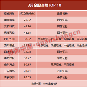 涨幅第二的则是 国信证券 推荐的 光弘科技 ,3月份涨幅为49.16%; 西南证券 推荐的 思维列控 则涨幅居于第三。此外, 四川九洲 、 洛阳钼业 3月份涨幅均超35%,这两只股票均是3月份的大热门,分别获得4家券商共同推荐。