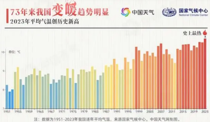 中国天气网联合国家气候中心公布一组分析调查,梳理我国1951至2023年气温大数据,深入解读了“73年间我国冷暖之变”。其中,2023年,我国平均气温达到10.7℃,刷新了2021年才创下的最暖纪录,成为新的“史上最热年”。从1951年至2023年逐年平均气温的演变也可以看出,我国变暖趋势明显,尤其是21世纪以来气温显著上升。73年来最热的三个年份,正是刚刚过去的三年,也就是2021年、2022年、2023年。