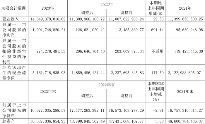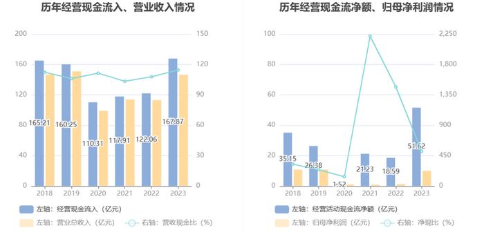 2023年,公司经营活动现金流净额为51.62亿元,同比增长177.59%;筹资活动现金流净额-35.69亿元,同比减少1138.33万元;投资活动现金流净额11.11亿元,上年同期为1.93亿元。