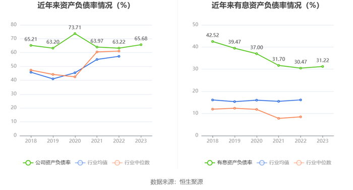 在偿债能力方面,公司2023年年末资产负债率为65.68%,相比上年末上升2.46个百分点;有息资产负债率为31.22%,相比上年末上升0.75个百分点。
