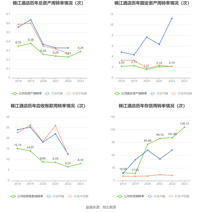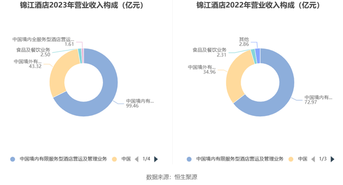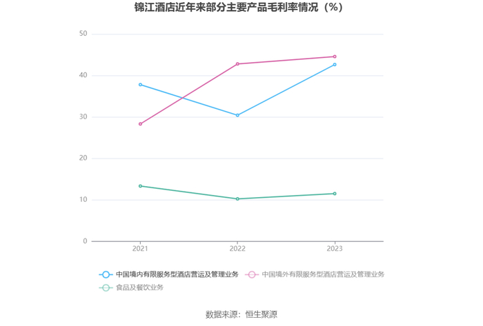分产品看,中国境内有限服务型酒店营运及管理业务、中国境外有限服务型酒店营运及管理业务、食品及餐饮业务2023年毛利率分别为42.64%、44.57%、11.52%。