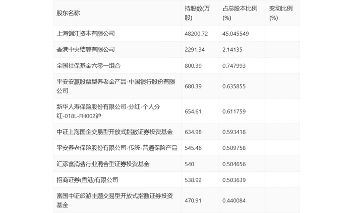 年报显示,2023年年末公司十大流通股东中,新进股东为平安养老保险股份有限公司-传统-普通保险产品,取代了三季度末的富国消费主题混合型证券投资基金。在具体持股比例上,平安安赢股票型养老金产品-中国银行股份有限公司、招商证券(香港)有限公司持股有所上升,香港中央结算有限公司、中证上海国企交易型开放式指数证券投资基金、富国中证旅游主题交易型开放式指数证券投资基金持股有所下降。