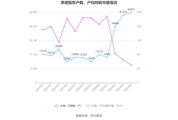 筹码集中度方面,截至2023年年末,公司股东总户数为4.29万户,较三季度末增长了1501户,增幅3.63%;户均持股市值由三季度末的65.65万元下降至50.92万元,降幅为22.44%。