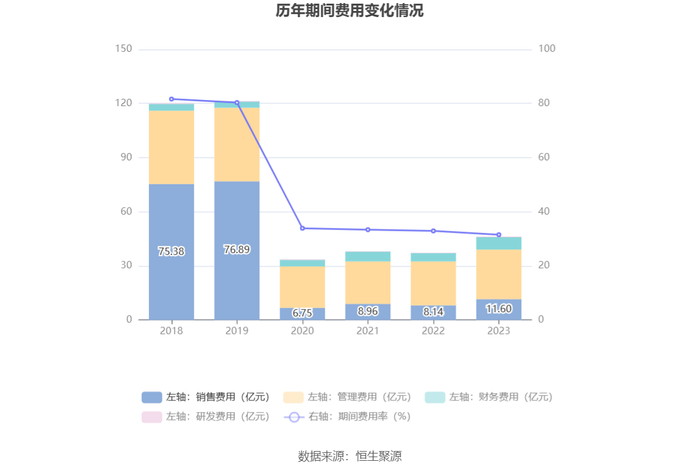 2023年,公司期间费用为46.19亿元,较上年同期增加8.95亿元;但期间费用率为31.53%,较上年同期下降1.40个百分点。其中,销售费用同比增长42.44%,管理费用同比增长12.79%,研发费用同比增长46.96%,财务费用同比增长50.05%。