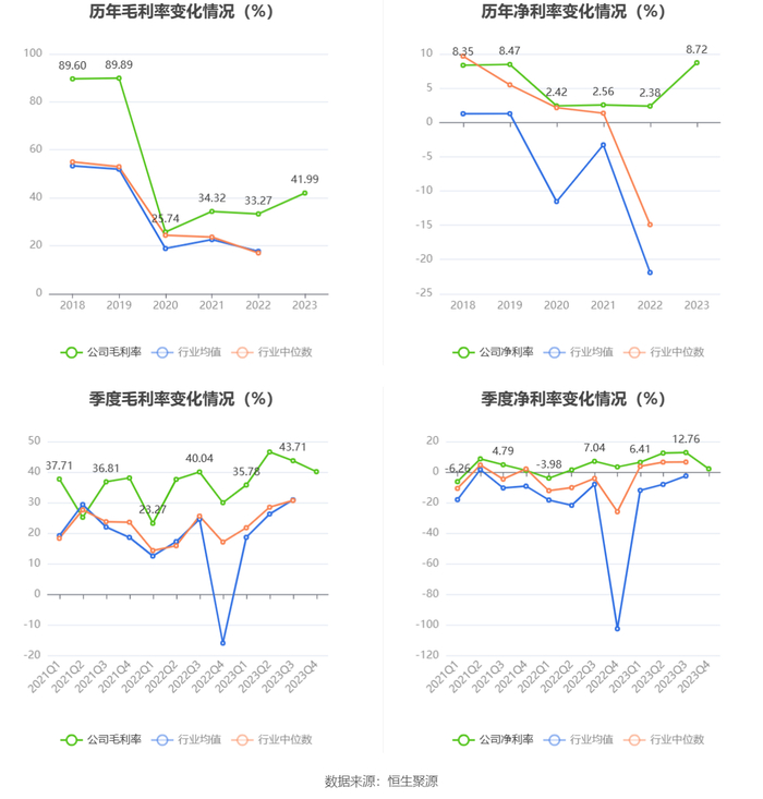 2023年,公司毛利率为41.99%,同比上升8.72个百分点;净利率为8.72%,较上年同期上升6.34个百分点。从单季度指标来看,2023年第四季度公司毛利率为40.14%,同比上升10.13个百分点,环比下降3.57个百分点;净利率为2.11%,较上年同期下降1.25个百分点,较上一季度下降10.65个百分点。