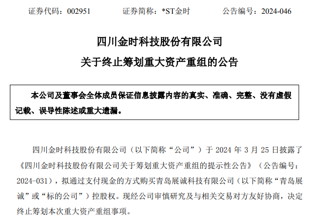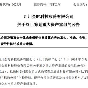 4月1日晚间,*ST金时(002951)披露公告称,公司审慎研究并与相关交易方友好协商后,决定终止筹划重大资产重组事项。