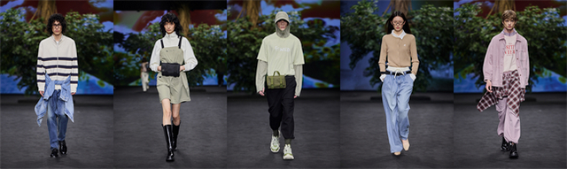 整场搭配将卫衣、T恤等单品巧妙叠搭,融合知识分子的优雅风格,呈现出当代都市的多样面貌。格纹、牛仔元素点缀其间,彼此碰撞,在格调中寻求经典与现代的平衡。模特身着多彩服饰穿梭于都市与自然的不同场景,松弛中不失精致感。