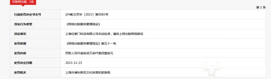 信用中国(上海)显示,上海任意门因未经批准,擅自上网出版网络游戏,违反了《网络出版服务管理规定》,被上海市浦东新区文化体育和旅游局于2023年11月15日罚款37.71万余元。