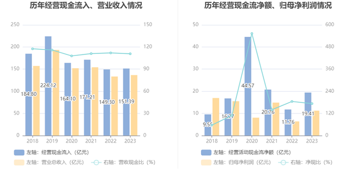 2023年,公司经营活动现金流净额为19.41亿元,同比增长65.08%;筹资活动现金流净额-7.83亿元,同比增加8.64亿元;投资活动现金流净额5.66亿元,上年同期为18.67亿元。