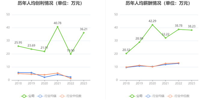 截至2023年末,公司员工总数为3097人,人均创收441.09万元,人均创利36.21万元,人均薪酬38.23万元,较上年同期分别变化5.91%、81.97%、-1.41%。