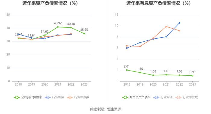 在偿债能力方面,公司2023年年末资产负债率为35.95%,相比上年末下降4.43个百分点;有息资产负债率为0.99%,相比上年末下降0.09个百分点。