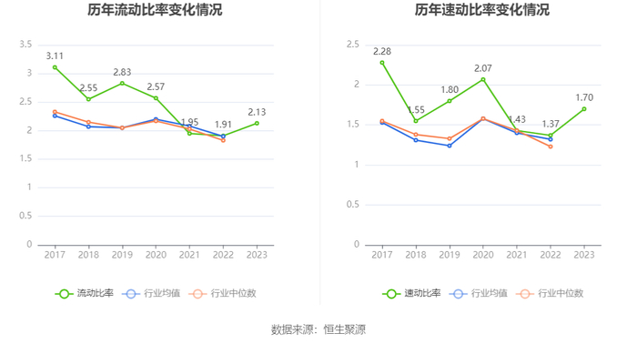 2023年,公司流动比率为2.13,速动比率为1.70。