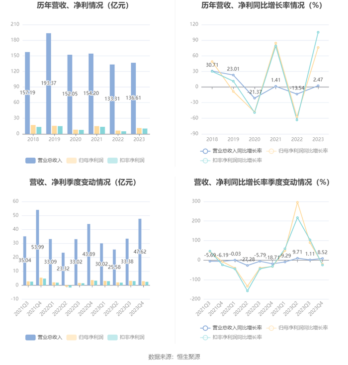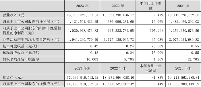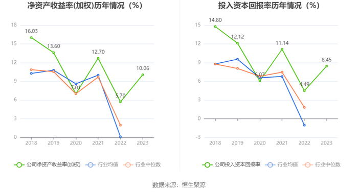 数据显示,2023年公司加权平均净资产收益率为10.06%,较上年同期增长4.36个百分点;公司2023年投入资本回报率为8.45%,较上年同期增长3.96个百分点。