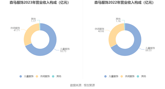 分产品来看,2023年公司主营业务中,儿童服饰收入93.73亿元,同比增长4.92%,占营业收入的68.61%;休闲服饰收入41.71亿元,同比下降2.58%,占营业收入的30.54%。