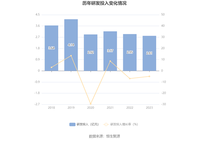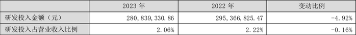 2023年全年,公司研发投入金额为2.81亿元,同比下降4.92%;研发投入占营业收入比例为2.06%,相比上年同期下降0.16个百分点。此外,公司全年研发投入资本化率为0。
