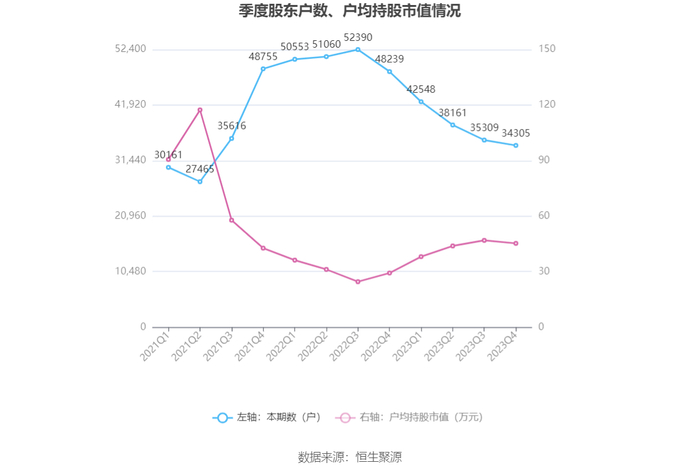 筹码集中度方面,截至2023年年末,公司股东总户数为3.43万户,较三季度末下降了1004户,降幅2.84%;户均持股市值由三季度末的46.92万元下降至45.31万元,降幅为3.43%。