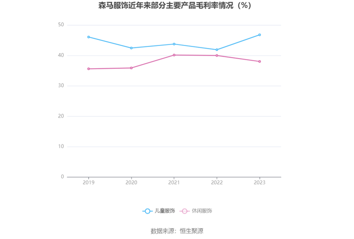 分产品看,儿童服饰、休闲服饰2023年毛利率分别为46.78%、38.02%。