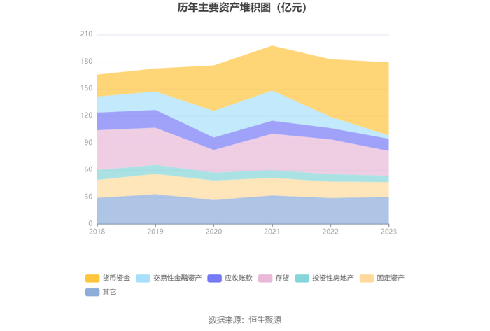 资产重大变化方面,截至2023年年末,公司货币资金较上年末增加27.23%,占公司总资产比重上升10.32个百分点;存货较上年末减少28.61%,占公司总资产比重下降5.75个百分点;交易性金融资产较上年末减少69.95%,占公司总资产比重下降4.73个百分点;固定资产较上年末减少9.17%,占公司总资产比重下降0.74个百分点。