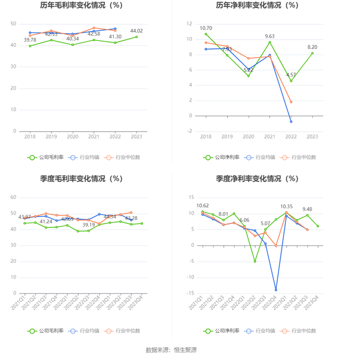 2023年,公司毛利率为44.02%,同比上升2.72个百分点;净利率为8.20%,较上年同期上升3.63个百分点。从单季度指标来看,2023年第四季度公司毛利率为43.83%,同比上升0.73个百分点,环比上升0.55个百分点;净利率为6.07%,较上年同期下降2.08个百分点,较上一季度下降3.41个百分点。