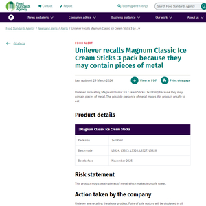 4月1日,“多批次梦龙雪糕被召回”冲上微博热搜引起关注。日前,英国食品标准局官网发布消息称,因可能含有金属碎片,联合利华(Unilever)宣布召回多个生产批次的梦龙经典系列冰淇淋。