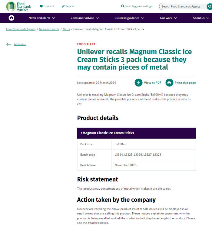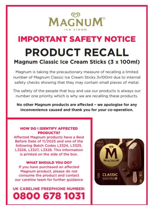 英国食品标准局官网公布的信息显示,涉事梦龙冰淇淋的规格为3x100ml,保质期至2025年11月,批号分别为L3324、L3325、L3326、L3327和L3328。