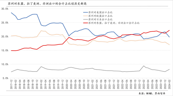 此消彼长之下,苏州对东盟、拉丁美洲、非洲出口的合计占比进一步上升,在今年前两个月创下历史新高。