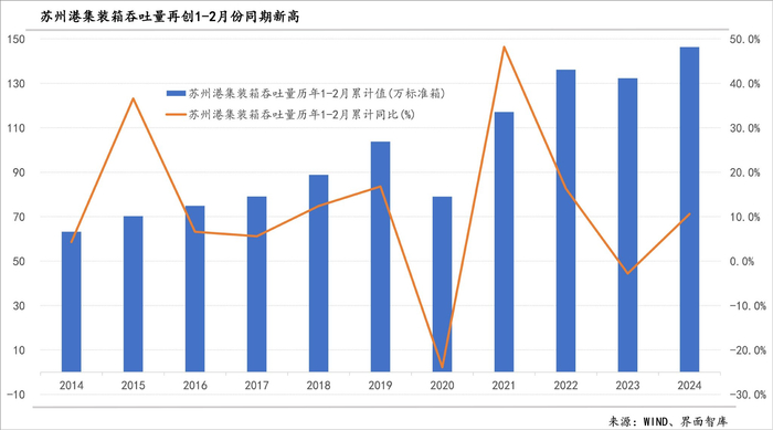 经济活动明显增加,苏州客货运量大幅增长。一方面,线下出行人数保持较高增速。前两个月,苏州地铁客运量同比增长34%,较上年同期进一步加速;铁路客运继续保持较高增速,前两个月的客运量不仅超过此前四年,甚至比疫情前的2019年还多增27%;水路客运量创下2014年有统计以来新高;前两个月同期公路客运量结束了连续9年的下降态势,在今年前两个月同比回升了12%。