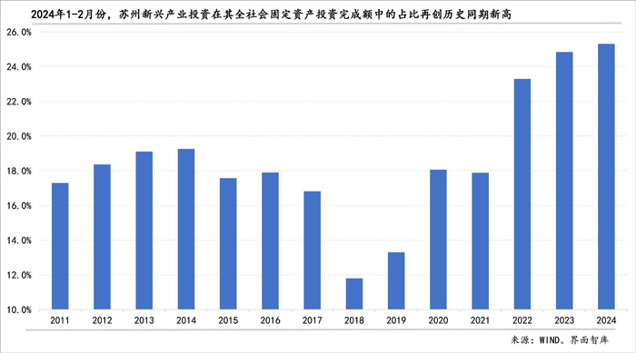 苏州市新兴产业中的高端装备制造业、新能源、生物技术和新医药、新材料都保持了较高增长速度,由此推动苏州市新兴产业投资在苏州全社会固定资产投资完成额中的占比也创下了历年1-2月份的新高。