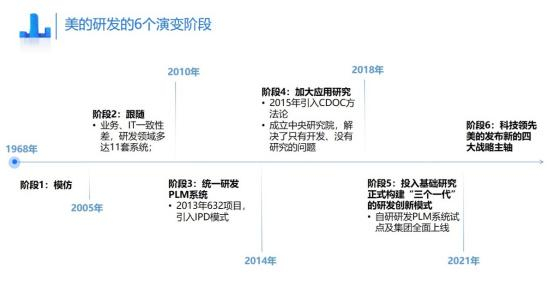 这个数字化阶段目的只有一个:统一!2013年,美的研发通过IPD模式的导入建立一体化的信息系统,将流程优化作为首要工作,实现整个研发流程端到端的拉通,以确保各单位经营语言一致、业务透明,构建起四级研发体系与“三个一代”技术架构。