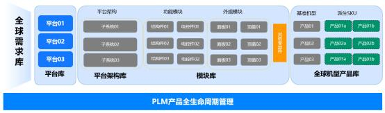 按从内到外的思路建立了层与层之间的关联逻辑,把外观和功能都模块化,先有基础,再有(逻辑)约束条件,再按照逻辑派生;在平台框架基础上,满足国家/区域的基本性能要求,带有基本功能和基础外观框架;在基准型基础上,外观和功能等差异化需求按照既定规则生成的最小销售单元(SKU)。