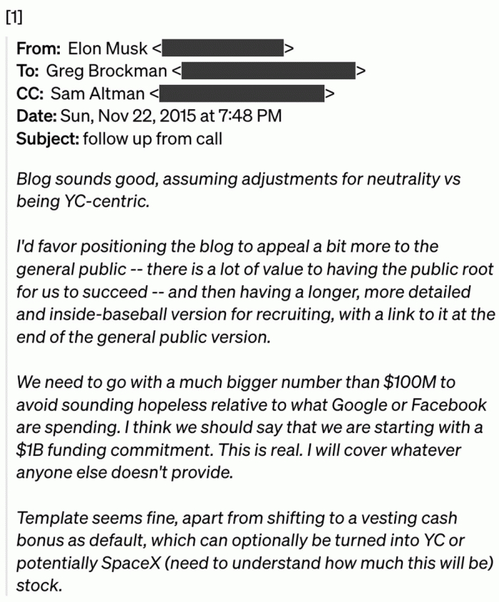 面对曾经创始人的步步紧逼,OpenAI也没闲着。他们公布了与马斯克的一系列邮件往来自证清白。主要意思包括:1.当年转向盈利,是你马斯克也同意的;2.马斯克退出OpenAI,是因为索要更多股权和董事会控制权,甚至要求OpenAI并入特斯拉,被董事会否决了;3.马斯克已经在2018年撤资,并且其投资额根本没有他本人说的那么多。