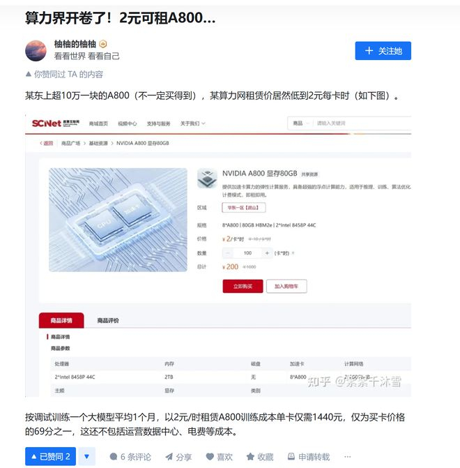 有评论表示,A800单卡线上租赁市价也就10元左右,但2块确实是“骨折价”了。也有评论称,这个价格“有促销既视感,不知道跟进卷的还有哪家”。