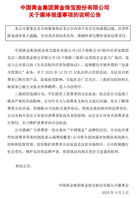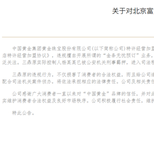 公告称,北京三鼎原黄金珠宝有限公司(以下简称三鼎原)运营的北京富力广场店,违反与公司签订的《专卖店特许经营加盟协议》,违规擅自开展所谓的“金条无忧预订”业务,并于2023年12月27日私自停止经营活动,无法兑付消费者已购买的产品,其原实际控制人杨某某已被公安机关刑事羁押,进入司法程序。