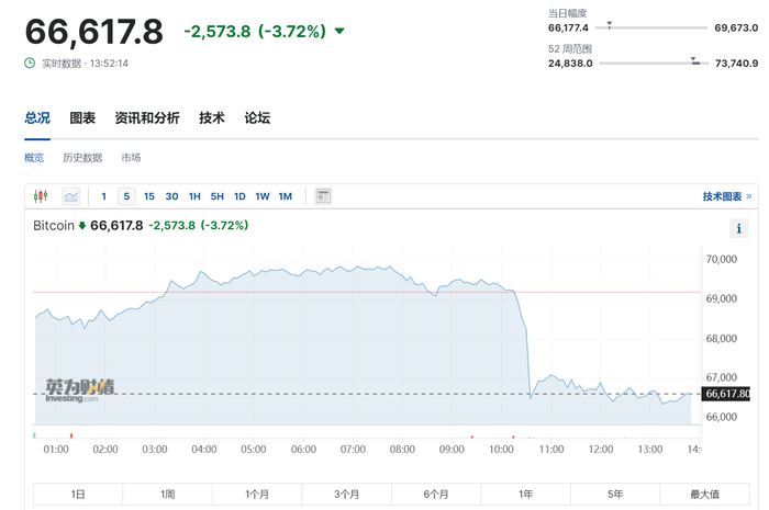 截至发稿,比特币报66617.8美元/枚,跌幅3.72%。
