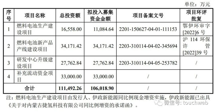 其中,1.1亿用于燃料电池生产建设项目,3.42亿用于燃料电池新产品产线建设项目,2.78亿用于研发中心升级建设项目,3.3亿用于补充流动资金项目。