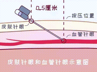 静脉穿刺时,多数情况下会有“两个穿刺点”,一个是进入皮下的穿刺点,另一个是通过血管壁的穿刺点。两个穿刺点之间往往会有一定距离,如果只按压住皮肤处的穿刺点,而忽视血管处的穿刺点,则血液就会从血管处的穿刺点流入皮下组织形成淤血。