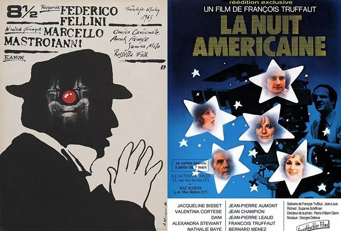 但电影从业者对元电影概念的实践比学术研究来得还要早。如1963年费里尼的《八又二分之一》和1973年特吕弗的《日以作夜》,是许多学者论及元电影时无法绕开的核心案例。前者是将一个拍片不顺的导演脑海中的焦虑,具象化地呈现出来;后者讲述了一个凌乱的剧组,导演一边要调和演员之间的关系,一边还要坚持自己的创作主旨。