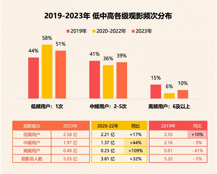 据灯塔报告显示,2019年高频观影用户(一年内观影6次及以上)占比达到15%,疫情三年内降至6%,2023年也仅回升至10%。