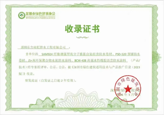3月,东方雨虹自主研发产品:PSD-520预铺防水卷材、SAM-924纤维增强型高分子膜基自粘沥青防水卷材、BCW-408高强水性橡胶沥青防水涂料以及JS+高环保聚合物水泥防水涂料四款产品,入选《深圳市绿色建筑适用技术与产品推广目录(2023)》。这份荣誉不仅是对东方雨虹产品综合性能优势的认可,也是对企业长久以来坚持绿色低碳发展的肯定。
