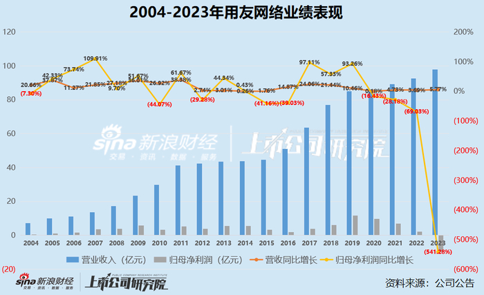 近日,用友网络发布了2023年年度报告。2023年用友网络实现营业收入97.96亿元,同比增长5.9%;实现归属于上市公司股东的净利润-9.67亿元,由盈转亏,相比上年同期减少541.3%,而在此之前,用友网络已经连续3年出现净利润的缩水,且缩水幅度明显扩大;实现扣非净利润-11.04亿元,相比上年同期减少854%。