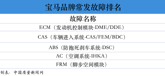 对于宝马品牌来说,常发的故障主要集中在ECM(发动机控制模块-DME/DDE)、CAS(车辆进入系统-CAS/FEM/BDC)、ABS(防抱死刹车系统-DSC)、AC(空调系统-IHKA)、FRM(脚步空间模块)。