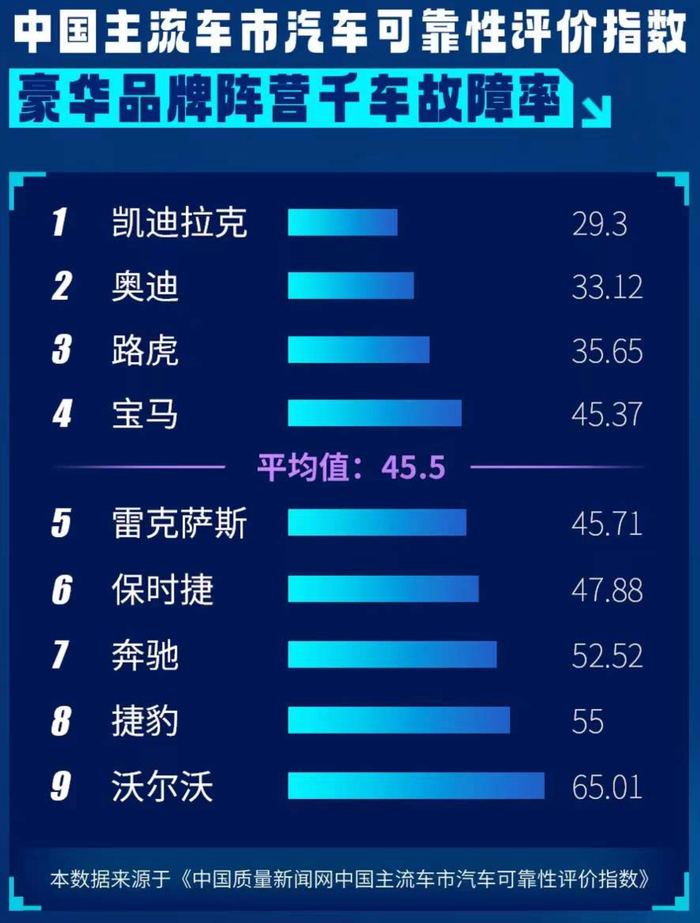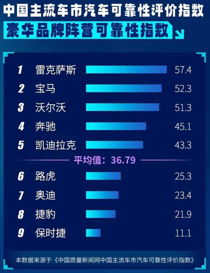 品牌千车故障率方面,以45.37的综合评分位居豪华品牌阵营第四的位置,且处于行业平均值之上。结合可靠性指数,可以直观看出宝马品牌在豪华品牌阵营中出现的故障频次相对较低,且鲜有涉及行车安全风险的可能。