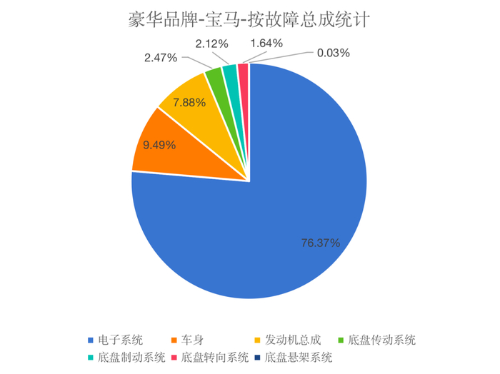在宝马品牌故障表现中,电子系统在品牌阵营中故障占比超过76%。与其它豪华品牌不同,宝马车身故障相比发动机系统故障偏高,排名第二。数据分析统计显示,宝马的底盘系统综合表现优秀,与市场表现、用户口碑基本吻合,带来更运动的驾乘体验。
