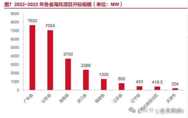 据不完全统计,2022 年全国海上风电项目开标规模约 14.61GW、2023 年约 8.68GW (不含国电投 2022 年 10.8GW、2023 年 16GW 框架招标)。截至 2023 年底,广东省、山 东省均有超过 7GW 的海风项目处于建设之中,海南省、浙江省紧随其后。叠加上述开标待 建的海风项目、各省市明确要并网但尚未开启招标的海风项目,国内海风具有较大的增量空 间,装机规模高增确定性持续走强。