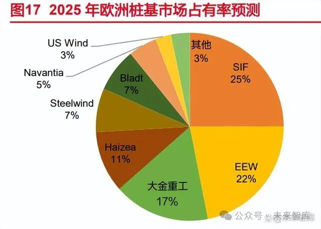 海工基础的安装进度,是风电场建设的“风向标”。从海上风电场建设的流程来看,风 电机组及其附属设备是自下而上的施工顺序,首先安装海工基础,其次安装塔筒,最后进行 风机的吊装。海工基础开始施工后,意味着风电场的建设正式开始,其供应量及交付速率, 决定了后续安装步骤能否顺利进行,风电场是否能在预定时间内完成建设并网。全球海工基 础的产量与需求,一定程度上反应了各地区海风项目开发建设的进度。 海外桩基企业集中度较高,扩产速度弱于需求增长。据欧洲桩基龙头企业 SIF 测算, 2021 年欧洲桩基市场占有率 CR4 约 89.4%。预计在大金重工及一些中小厂商陆续加入市场 后,2025 年欧洲桩基市场占有率 CR4 将下降至 74.1%,其中大金重工占比升至 17%。随 政策目标不断提升,欧洲海风前景越发强劲和确定,但受到高通胀、资本开支成本上升的影 响,欧洲本土供应能力落后于快速提高的装机需求。